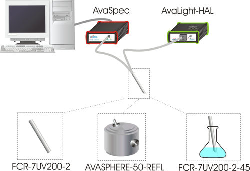 Generalmente, le misure colore degli oggetti e dei liquidi possono essere fatti in differenti setup, per esempio usando le sonde di riflessione o una sfera integratrice. Č necessario uno spettrometro con una gamma da 380 a 780 nm e una risoluzione spettrale di 5 nm FWHM. Serve poi una sorgente di luce bianca cosė come le mattonelle riflettenti bianche. Per le applicazioni differenti le sonde differenti possono essere usate. Un setup tipico per le misure colore in riflessione č datoi sotto.